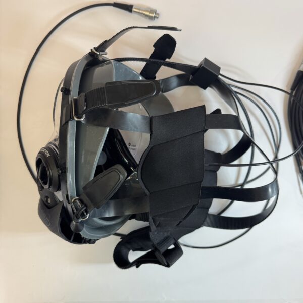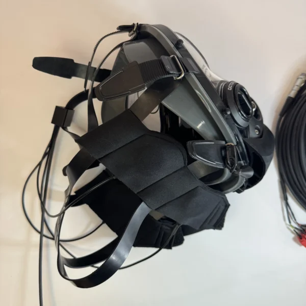 The headset mounts directly onto the mask’s strap assembly using a dedicated housing that positions the sealed earphone firmly against the diver’s ear — ensuring stable audio even during movement and depth changes. A separate adjustable neck/chin band secures a bone-conduction throat microphone against the skin, enabling clear speech pickup that is largely immune to bubbles, water flow noise, and regulator interference.